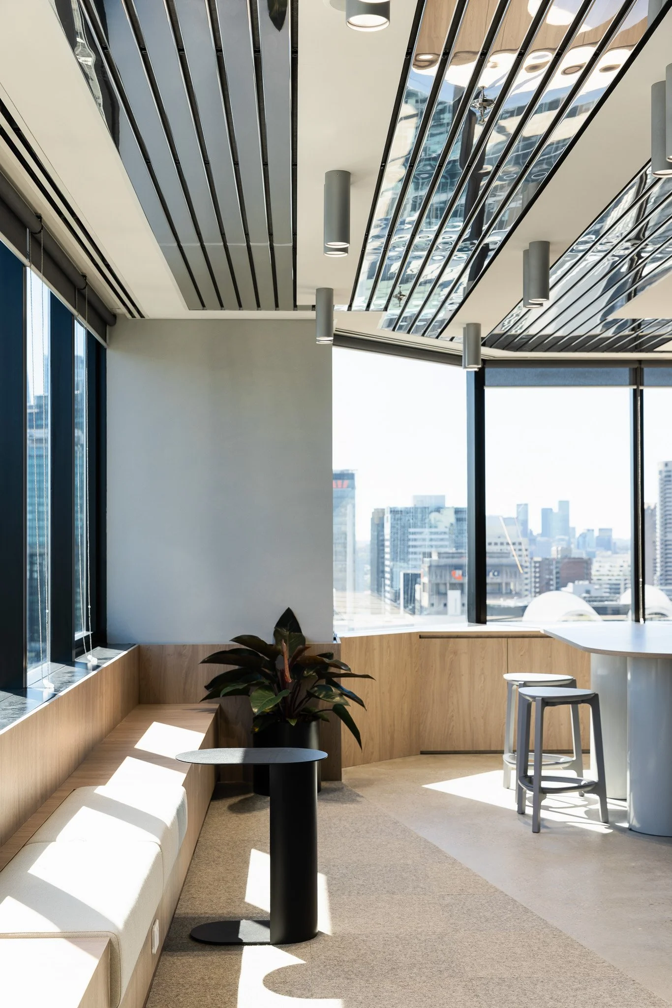 Similarly to the feature staircase installation, this project overall relied on steady communication between Sheldon’s construction, services, and manufacturing divisions. Complex works, including PT truncations, beam installations, and close coordination with the base building engineer, required detailed planning and this approach extended beyond just the structural elements. Joinery, electrical, and partitioning teams all workedtogether to strengthen the external design vision while introduce innovative materials and construction solutions throughout delivery. The result is a distinctive landmark space in the heart of the Sydney CBD, fully equipped for hosting events, large staff gatherings, walkthroughs and everyday office use.