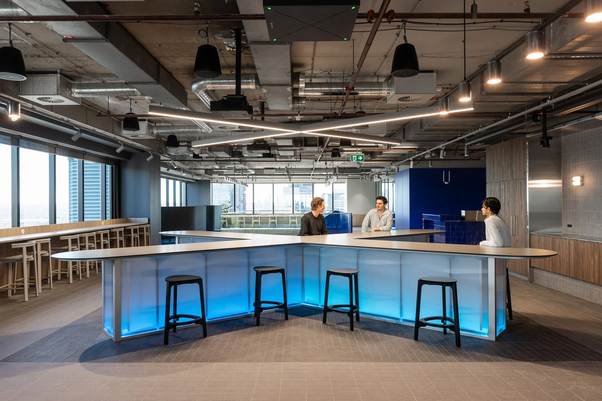 As visitors, and employees ascend the feature staircase, they’re greeted by more sweeping views of the CBD and an expansive collaboration zone with a custom table shaped in the form of a brand adjacent “X.” This distinctive piece serves as a central feature for events, positioned conveniently beside the kitchen.
