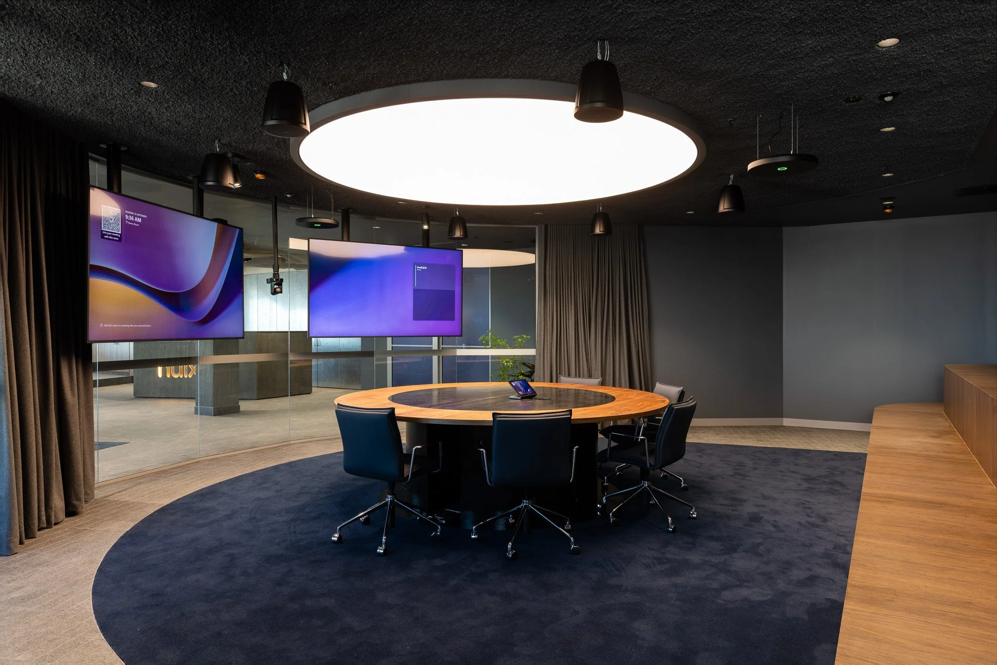 Level 30 contains an open plan workfloor and a range of meeting rooms that balance focus and interaction. The standout is the boardroom room at the top of the stairs, defined by a custom lighting rig that reflects the company’s signature brand identity.